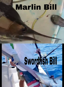 چونچ (Bill): سورڈ فش کا بِل لمبا، تلوار کی طرح چپٹا اور تلوار کے جیسے ہوتا ہے، جب کہ مارلن کا بِل سورڈ فش کے مقابلے چھوٹا، چپٹا کے بجائے تھوڑا گولائی میں اور نیزے کی طرح ہوتا ہے۔